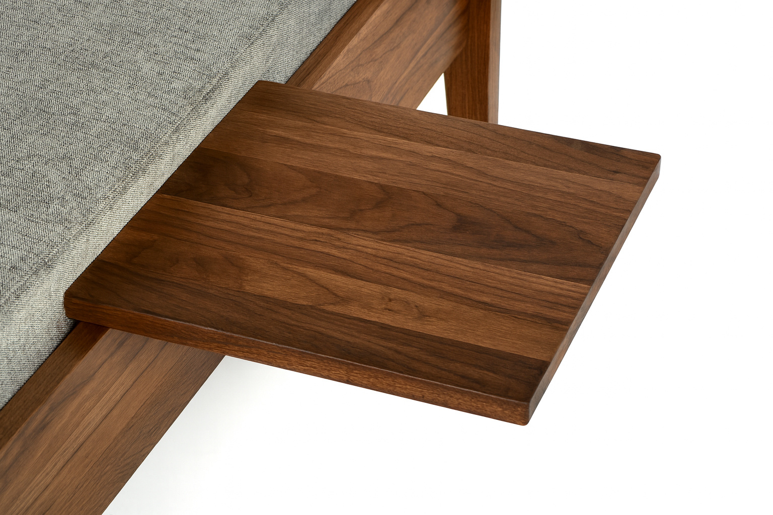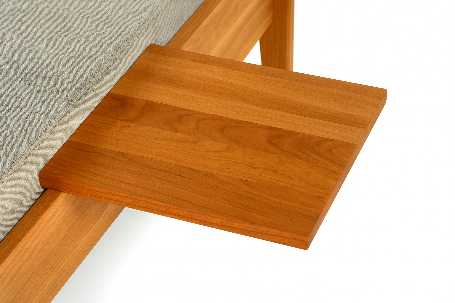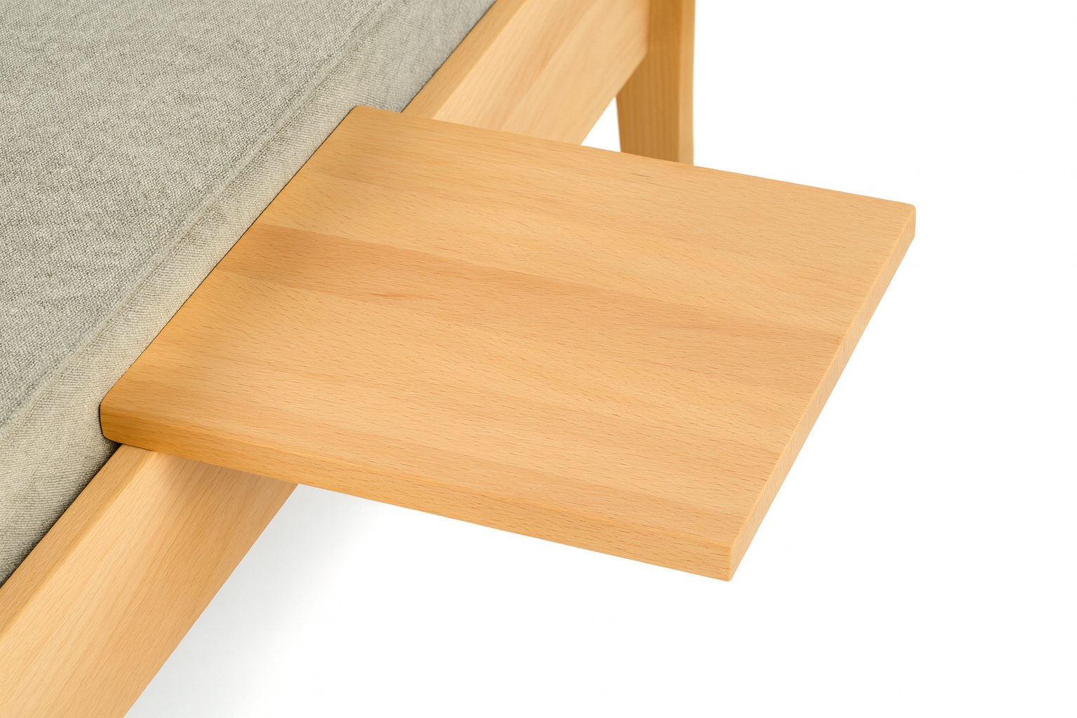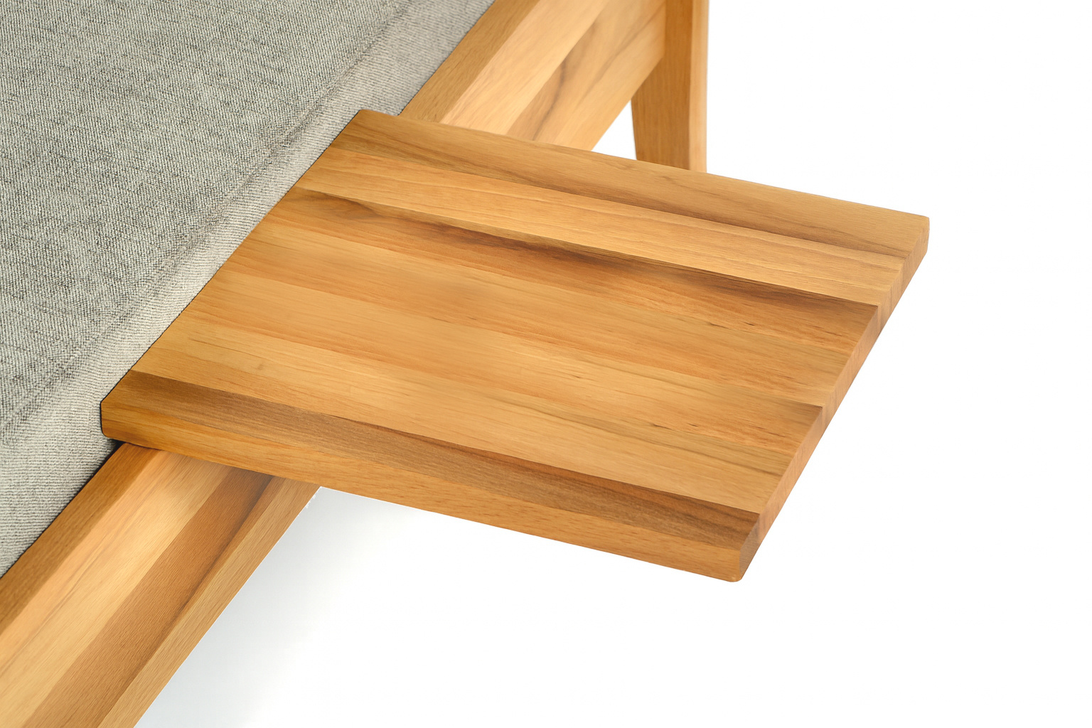 Die Ansteck-Ablage AT25 wird aus Massivholz gefertigt. Er lässt sich an beliebiger Stelle einfach auf die Bett-Seitenteile aufstecken. Eine kleine Stellschraube am Stützkeil ermöglicht die Nachjustierung in eine exakt waagrechte Position.