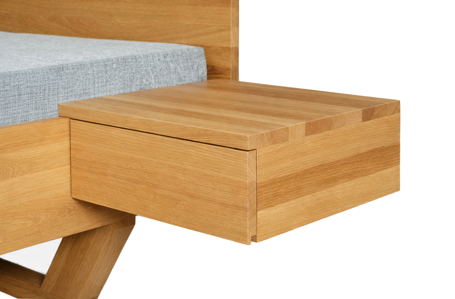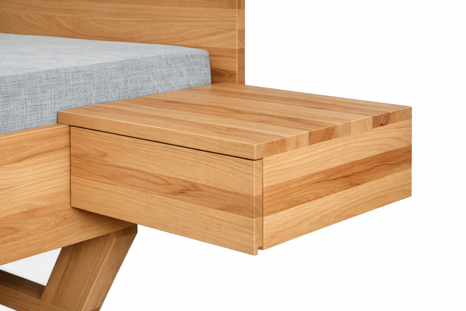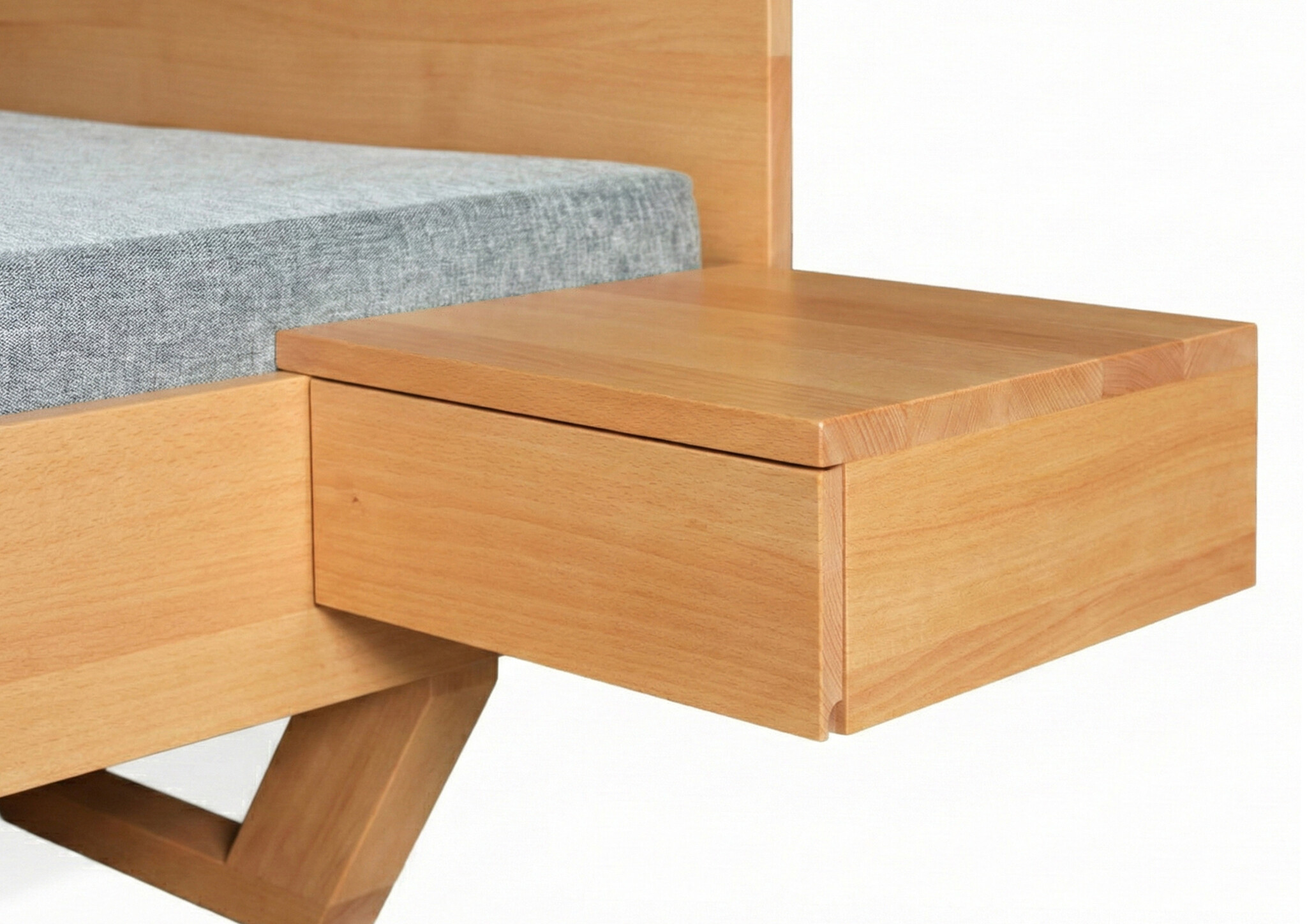 Die Ansteck-Nachttisch mit Schubfach wird aus Massivholz gefertigt. Er lässt sich an beliebiger Stelle einfach in die Bett-Seitenteile einhängen. Kein Bohren, kein Verschrauben erforderlich. Die Ansteck-Nachttisch sitzt stabil auf den Seitenteilen des Bettes und ist dank der platzsparenden Halterung aus Aluminium auch bei Lattenrosten mit motorisch oder manuell verstellbarem Kopfbereich problemlos einsetzbar: