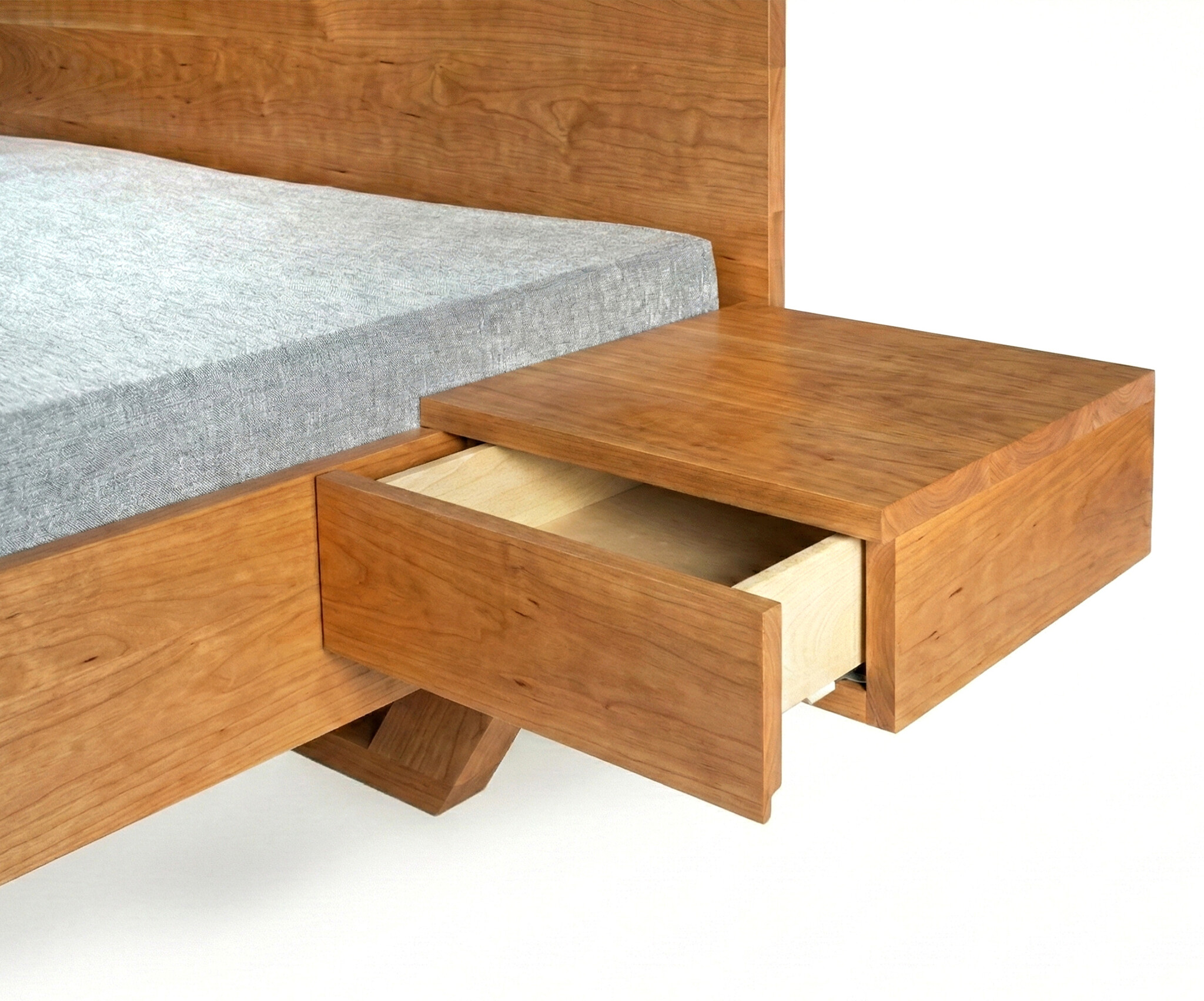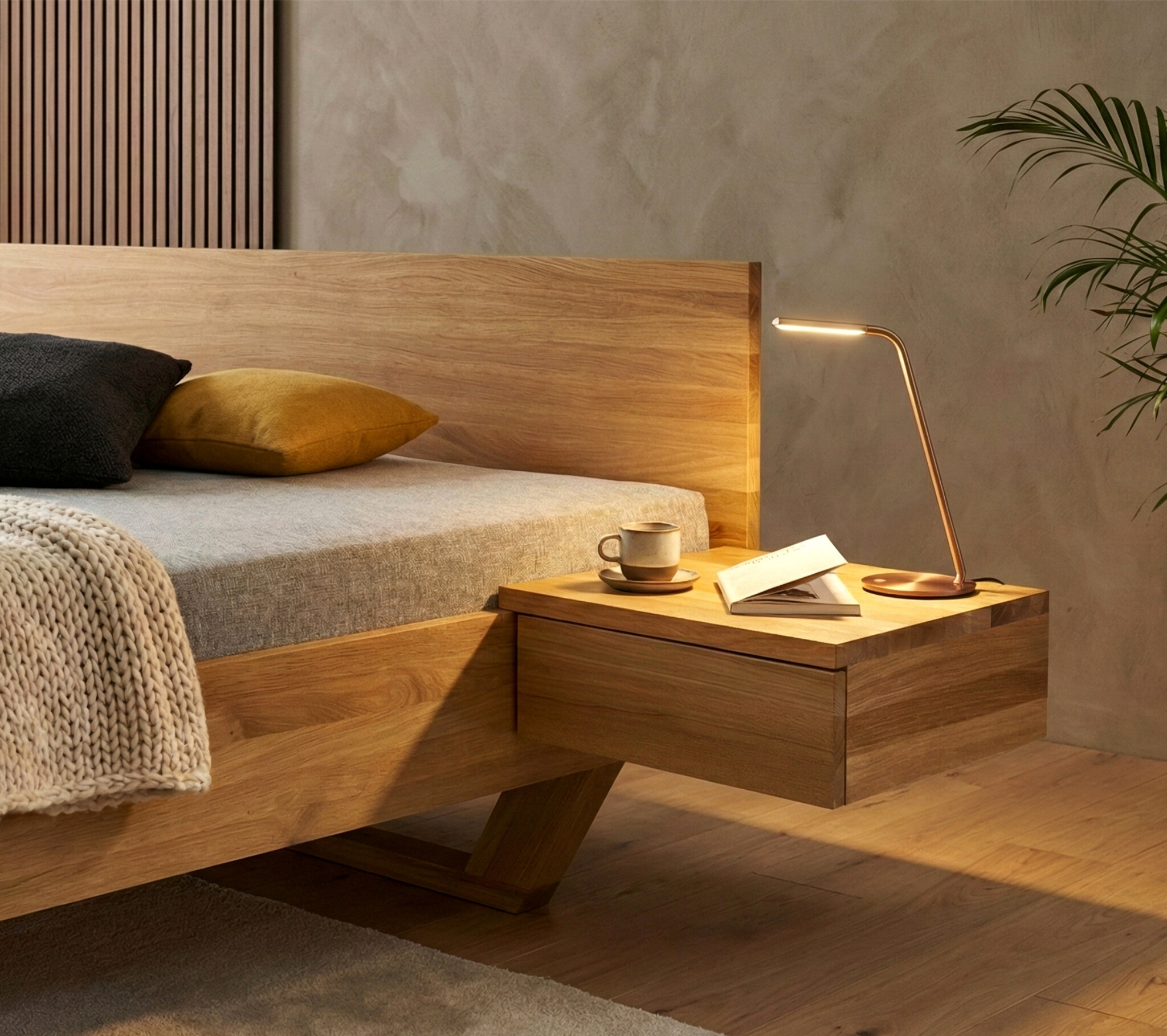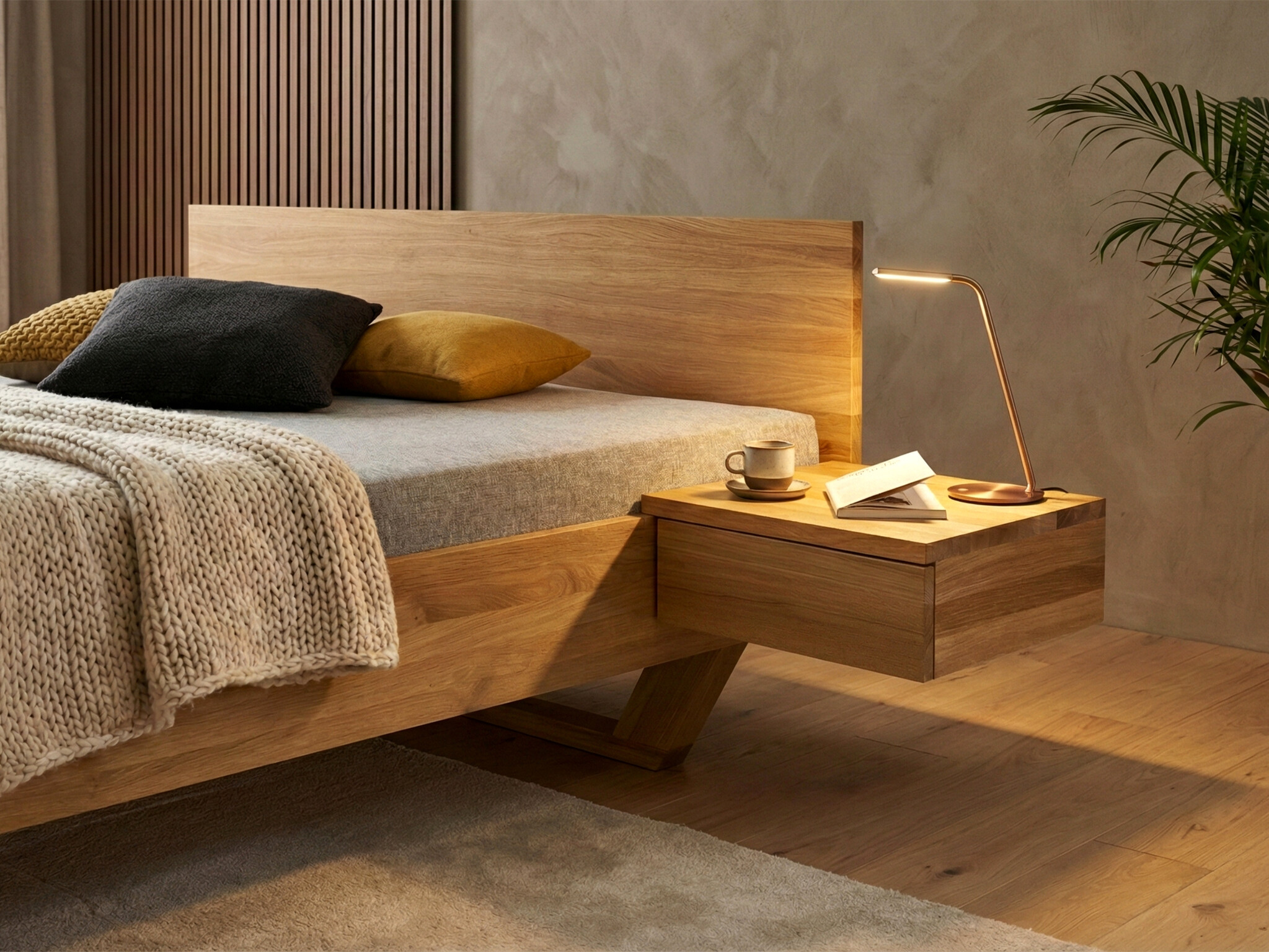Die Ansteck-Nachttisch mit Schubfach wird aus Massivholz gefertigt. Er lässt sich an beliebiger Stelle einfach in die Bett-Seitenteile einhängen. Kein Bohren, kein Verschrauben erforderlich. Die Ansteck-Nachttisch sitzt stabil auf den Seitenteilen des Bettes und ist dank der platzsparenden Halterung aus Aluminium auch bei Lattenrosten mit motorisch oder manuell verstellbarem Kopfbereich problemlos einsetzbar: