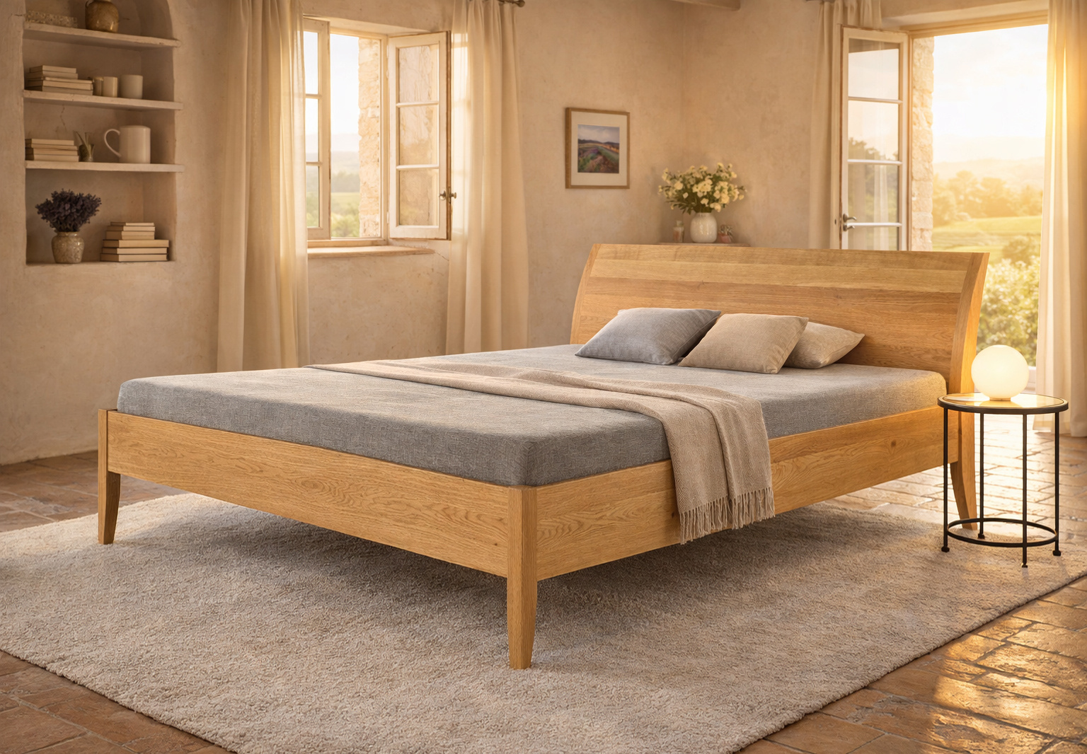 Dieses Bett vereint zeitlose Eleganz mit höchstem Komfort. Gefertigt zu 100% in Deutschland aus erlesenen Massivhölzern, überzeugt es durch seine warme Ausstrahlung und edle Handwerkskunst. Die komfortable Rahmenhöhe sorgt für müheloses Aufstehen – ohne Kompromisse in Design oder Leichtigkeit.