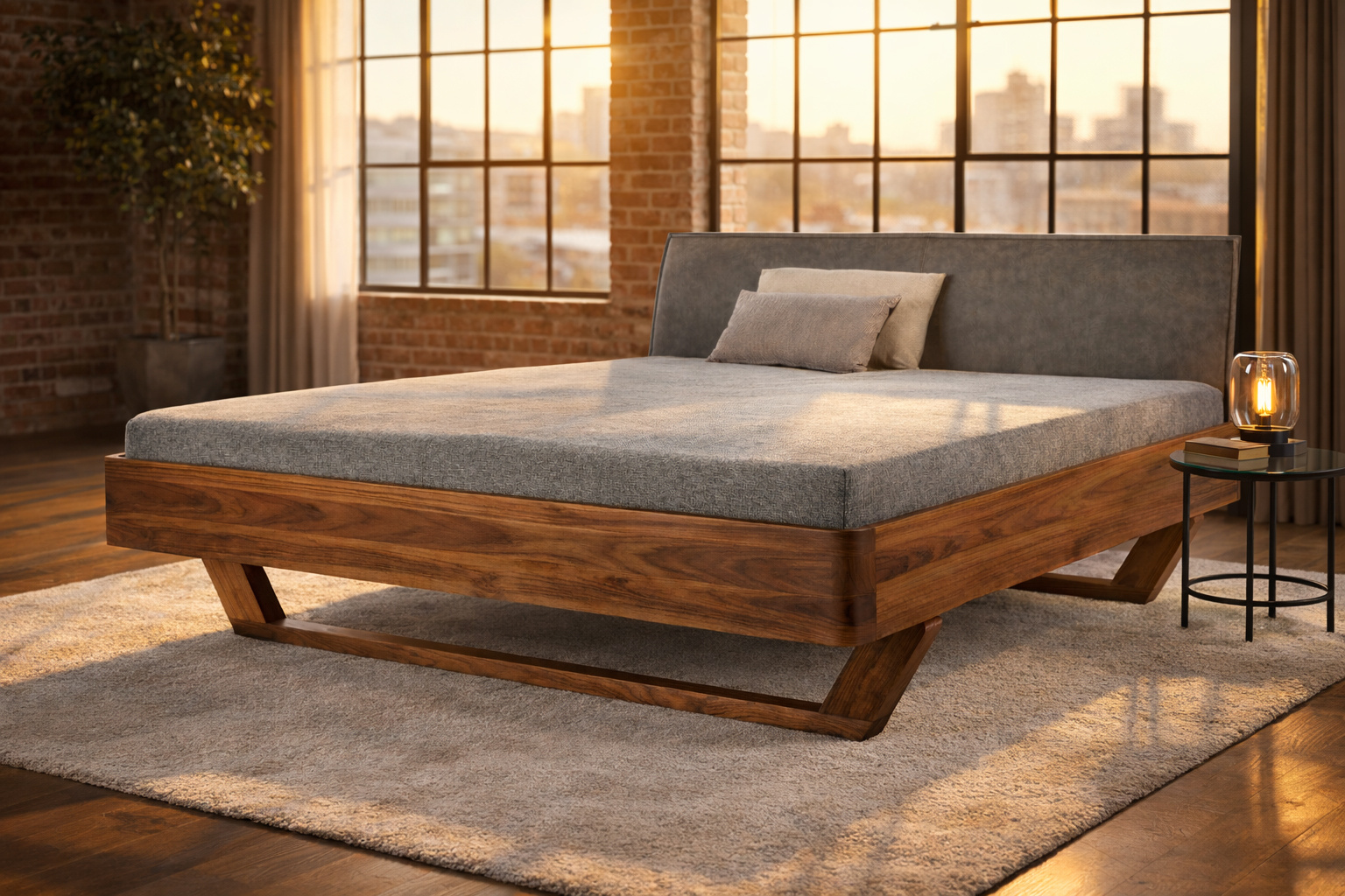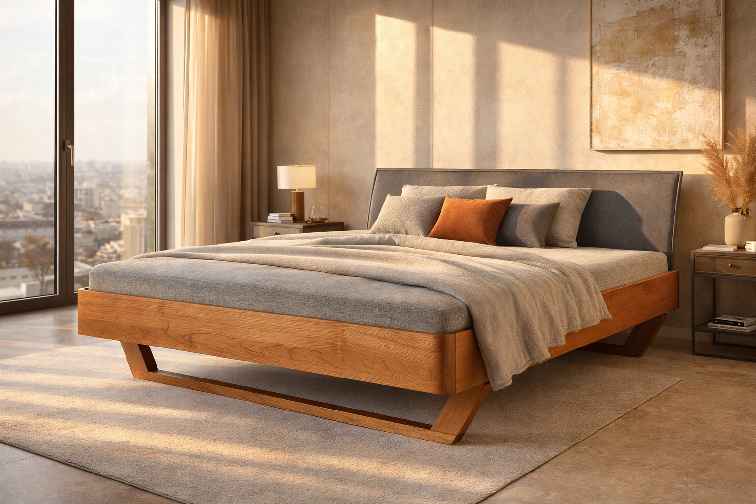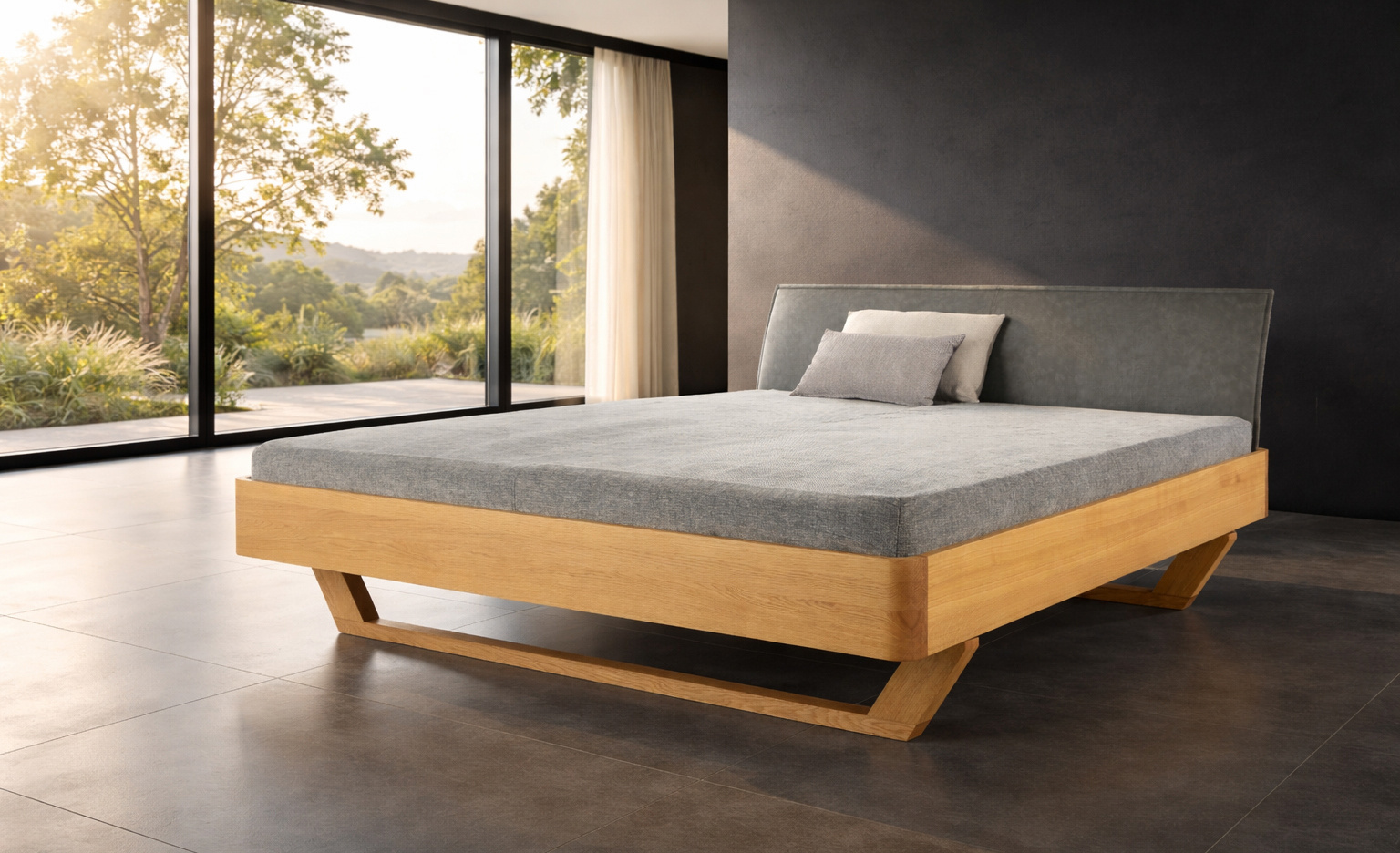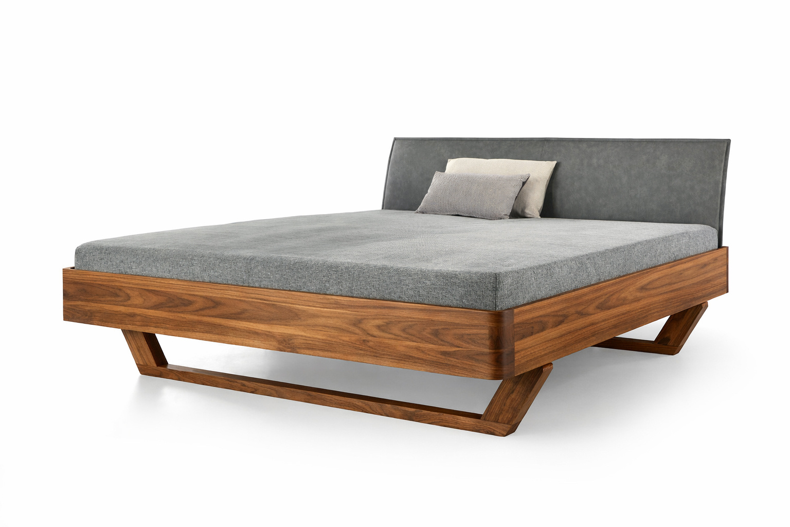 - Typ: Massivholzbett mit elegant ausgebogener Polster-Rückenlehne.
