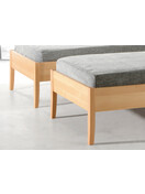 Durch massive Fußabschlüsse aus gebürstetem Aluminium (Option), welche von unten mit den Holzfüßen fest verschraubt werden, erhöht sich die Rahmenhöhe des Bettes von 40 cm auf 44 cm.