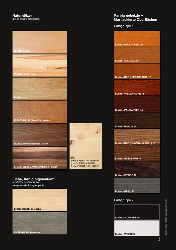 Neben der natur geölten und gewachsten Oberfläche, die Sie direkt im Shop bestellen können, bieten wir auch farbig gebeizte und lackierte Oberflächen für unsere Produkte an. Für die Bestellung eines Produkten in einer dieser Oberflächenausführungen senden wir Ihnen gerne ein entsprechend vorbereitetes Angebot zu.
