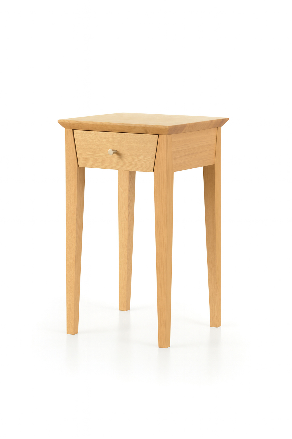 Nachttisch XANADU wird aus Massivholz gefertigt. Seine sich nach unten verjüngenden Beine in Verbindung mit einer schlanken Bauweise verleihen dem Nachtisch XANADU sein elegantes Aussehen. Der Tisch verfügt über ein kleines Schubfach mit einem Knopfgriff gebürstetem Edelstahl.