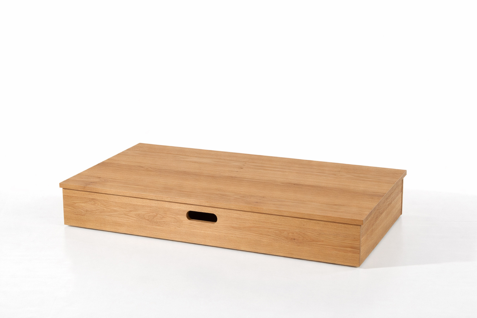 Der Rahmen des Bettkasten wird aus Massivholz gefertigt, für den Boden kommt eine strapazierfähige Furnierplatte zum Einsatz. Der Deckel (Option) wird aus Tischlerplatte hergestellt. Der Bettkasten ist mit 4 Laufrollen ausgestattet, geeignet für Hartböden und kurzflorige Teppiche.