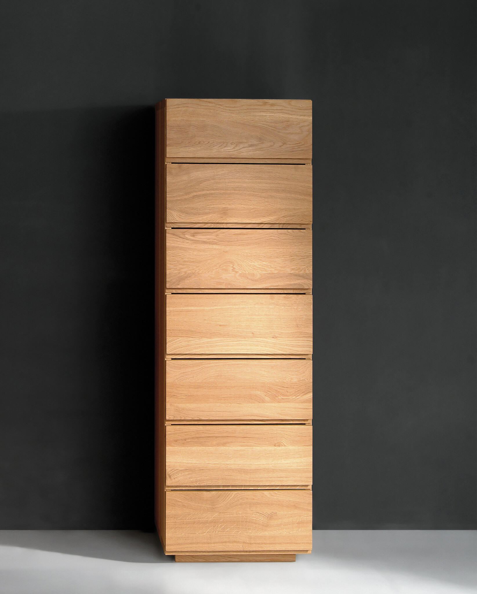 Die SLIMBOX-Schubfachkommoden werden aus Massivholz hergestellt und sind in 6 verschiedenen Höhenausführungen lieferbar. Der Korpus dieser Kommoden ist fest verleimt und fächenbündig verschliffen. Die Schubfächer lassen sich durch eine Griffausfräsung an der Unterkante der Schubfachblende öffnen.